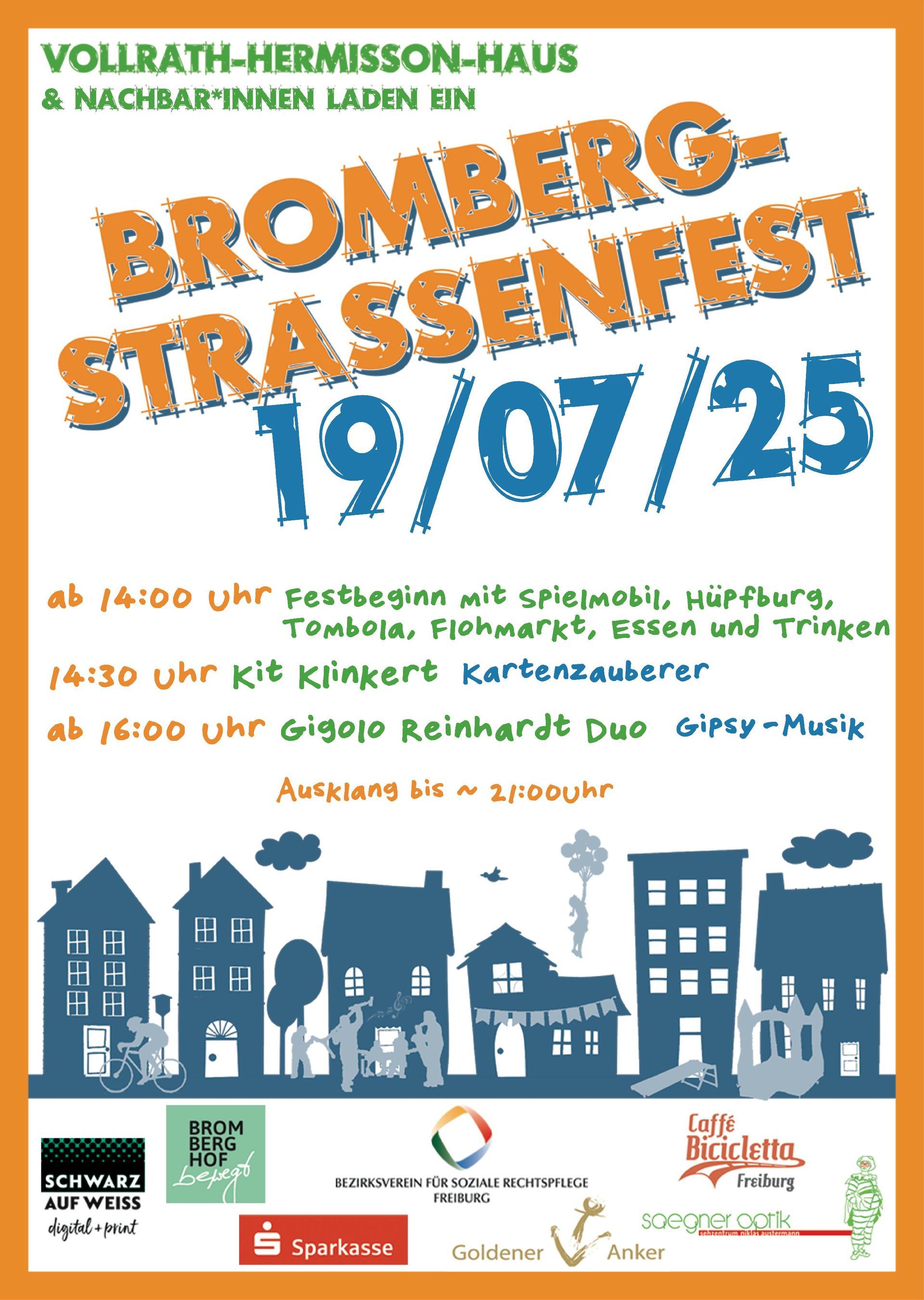 Im Rückblick freuen wir uns sehr über unser Brombergstraßenfest am 13.07.2024 und die zahlreichen Besucher*innen! An dieser Stelle möchten wir uns ganz herzlich bei allen Gästen, Mithelfenden, dem Kartenzauberkünstler Kit Klinkert , den Band s Gigolo Reinhardt Duo sowie Kiss El Funk bedanken, die das Fest zu dem gemacht haben, was es war! Ebenso geht ein ganz besonderer Dank an alle Sponsor*innen, die uns finanziell unterstützt haben.